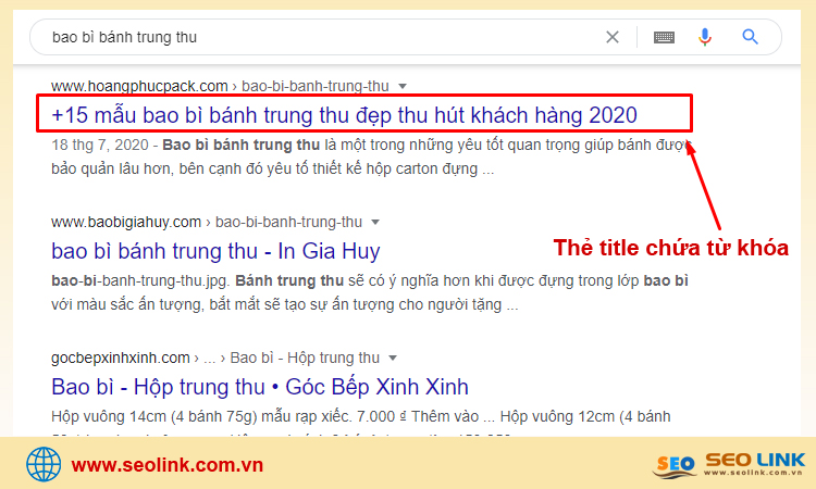 - Tiêu đề bắt buộc nên chứa từ khóa chính. Từ khóa nên nằm về phía bên trái đầu tiêu đề càng tốt.