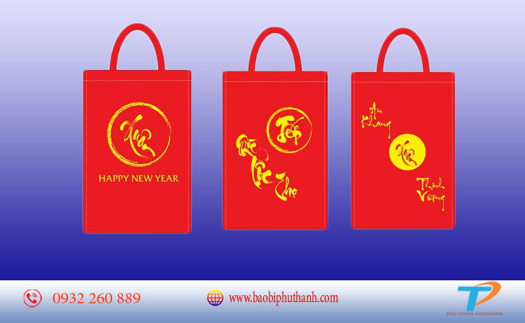 Túi được ứng dụng để đóng gói những sản phẩm, mặt hàng quà tặng tết nhỏ gọng, vừa vặn. Màu sắc phổ biến nhất là màu đỏ, trắng, vàng in trên bề mặt túi với những họa tiết mang không khí tết đến sum vầy như: hoa mai, hoa đào,… Và những thông tin của thương hiệu.