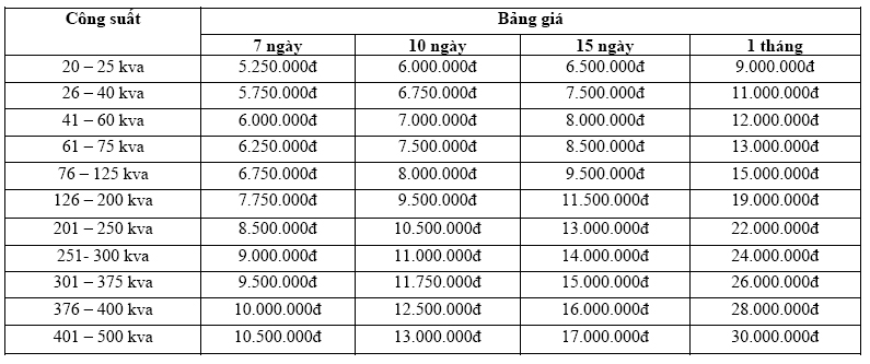 Dưới đây là bảng báo giá cho thuê máy phát điện tại Hiệp Phát các bạn có thể tham khảo, bảng báo giá này có thể thay đổi tùy vào thời điểm khách hàng thuê máy. Nếu có nhu cầu thuê máy phát điện với công suất cao hơn, các bạn vui lòng liên hệ hot line: 0933 595 626 để được tư vấn và báo giá cụ thể.