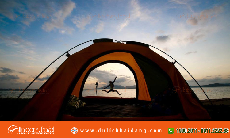 Ngủ lều ven biển sẽ là trải nghiệm cực kỳ thú vị và ấn tượng trong hành trình khám phá đảo Điệp Sơn. Do trên đảo rất khó mua đồ dùng, nên để cho trải nghiệm này được trọn vẹn nhất, bạn cần chuẩn bị lều và đầy đủ các dụng cụ cần thiết, thực phẩm, nước uống và đặc biệt là một bữa tiệc nướng BBQ thật vui nhộn nếu đi theo nhóm bạn, gia đình.