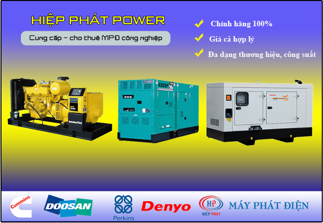 Hiệp Phát Power là đơn vị uy tín với nhiều năm kinh nghiệm trong lĩnh vực máy phát điện. Hiệp Phát chuyên cung cấp và cho thuê các dòng sản phẩm máy phát điện chính hãng 100% với nhiều thương hiệu nổi tiếng trên thế giới như: Cummins, Denyo, Doosan, Komatsu… với các dòng máy mới và cũ chất lượng 85 – 95%.
