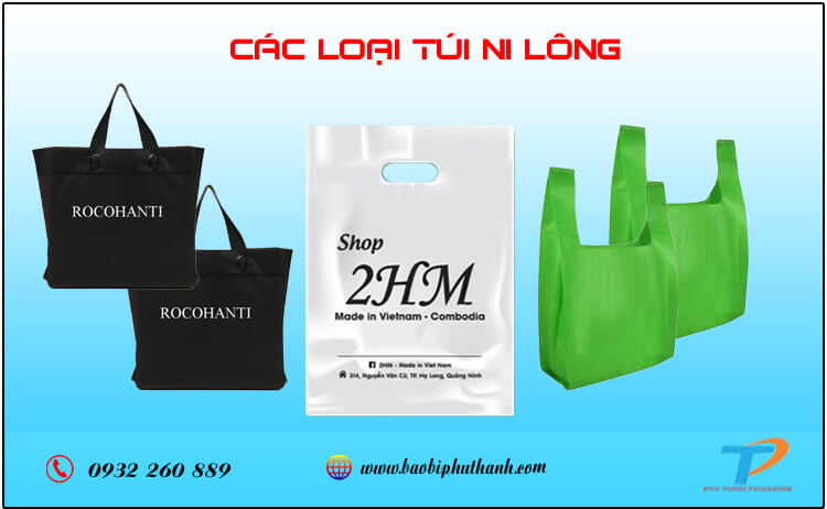 Túi ni lông 2 quai có rất nhiều màu và cũng rất nhiều kích thước, thường dùng để đựng thực phẩm khi chúng ta đi chợ, đi siêu thị; túi ni lông 2 quai trong suốt thường đựng hàng đại lý và tạp hoá; bao ni lông đen dùng để đựng rác…